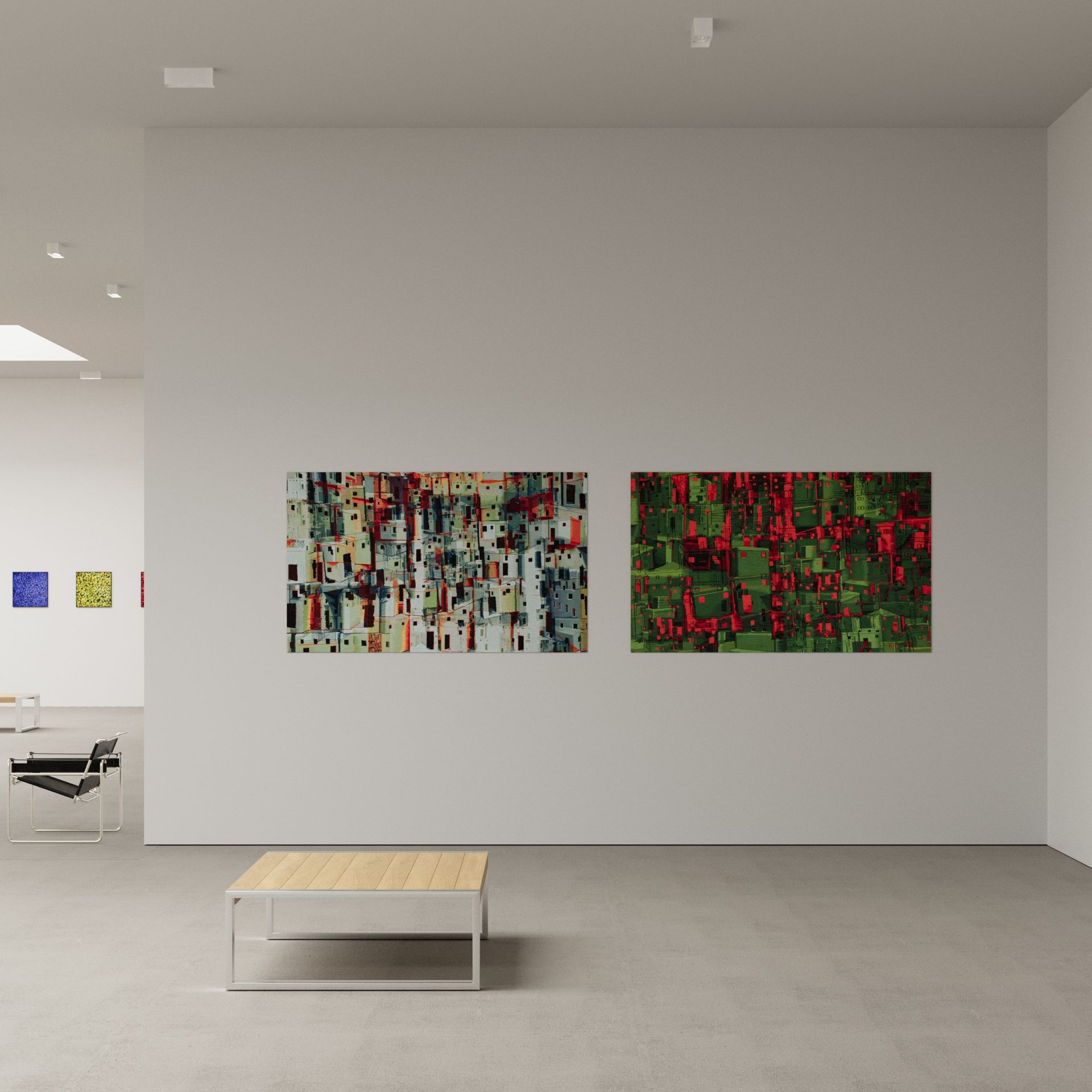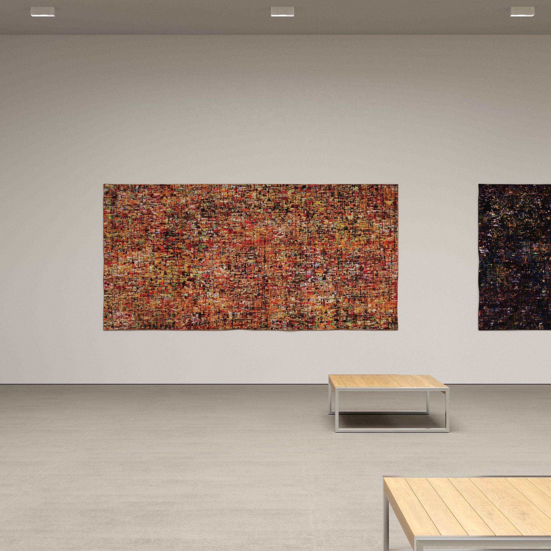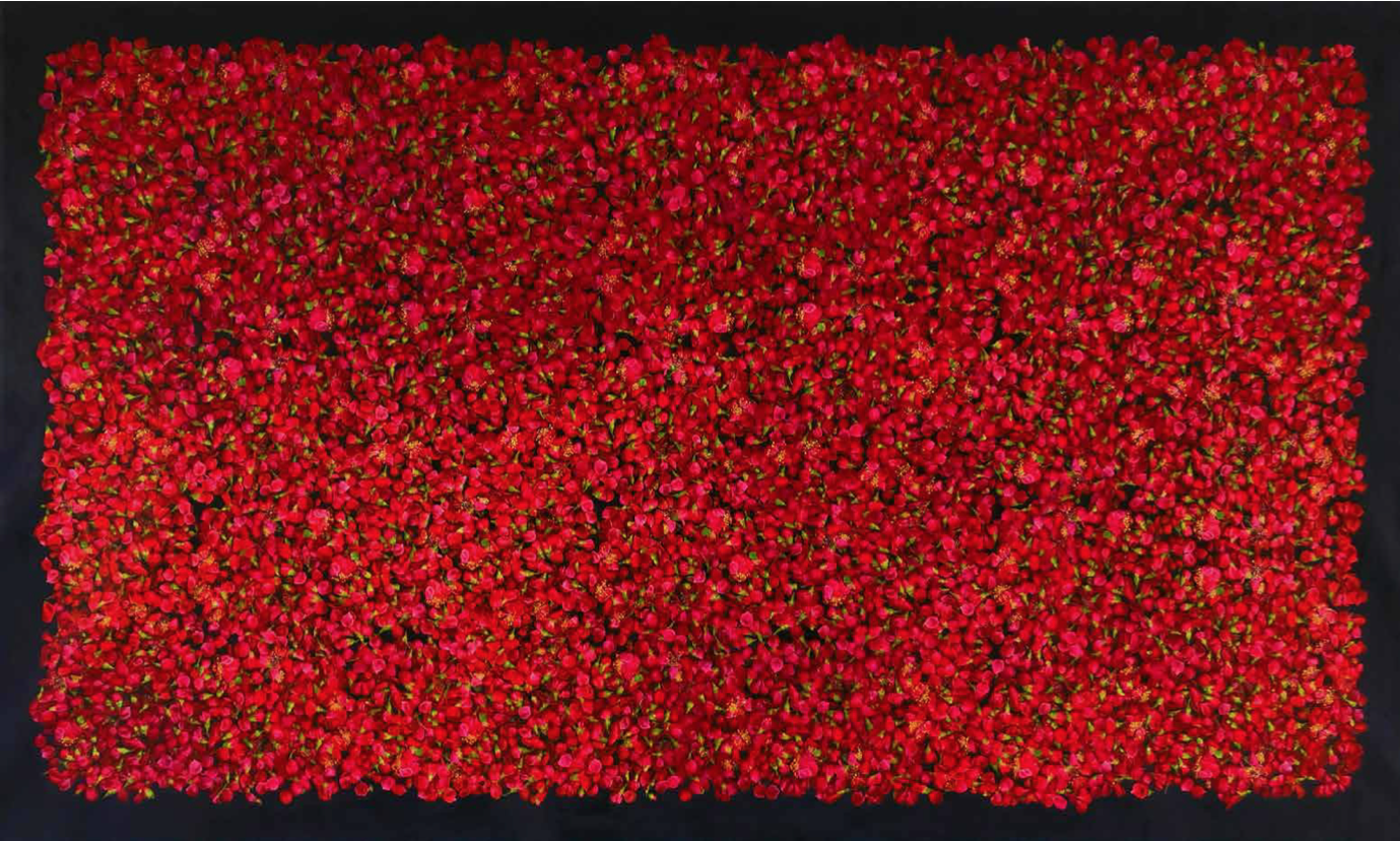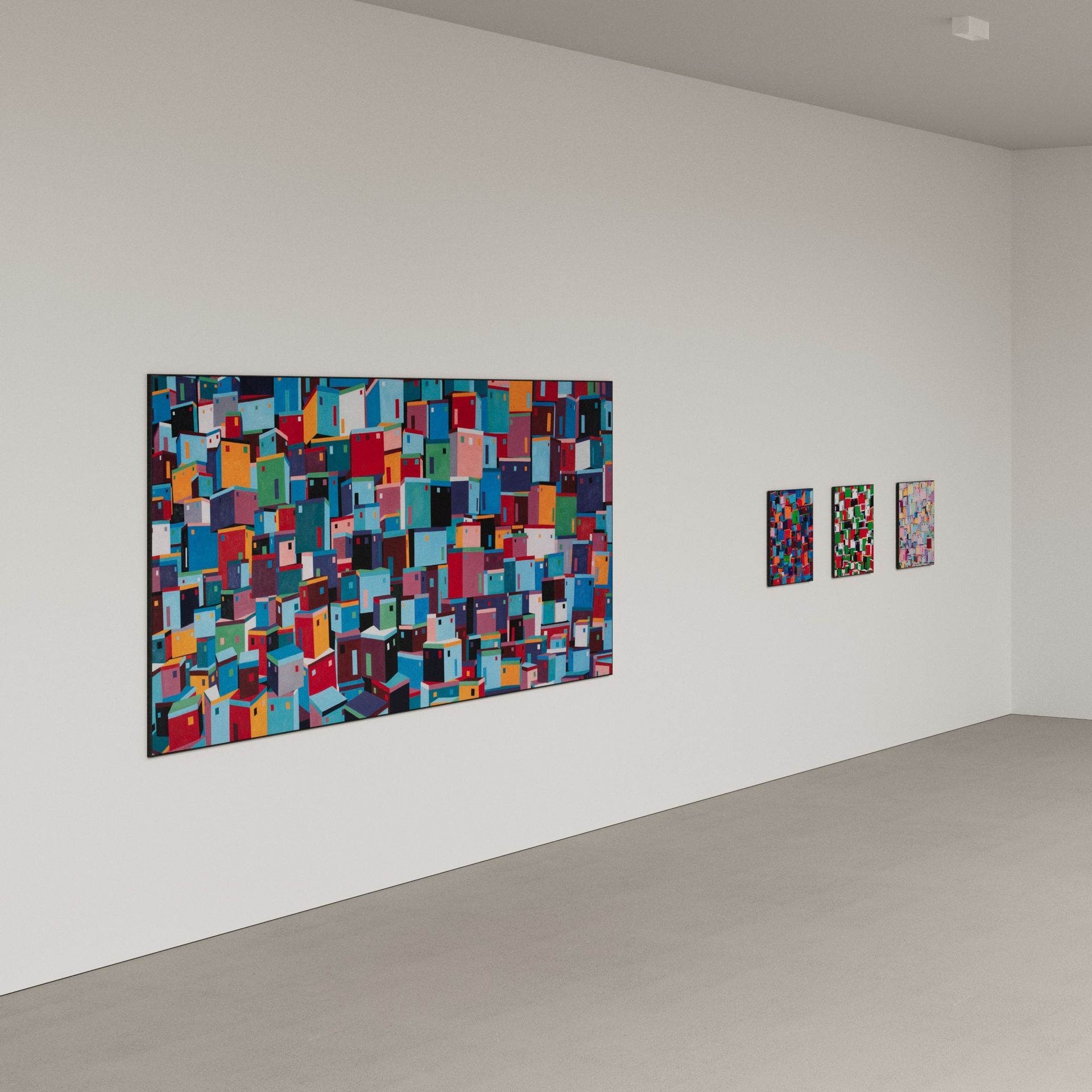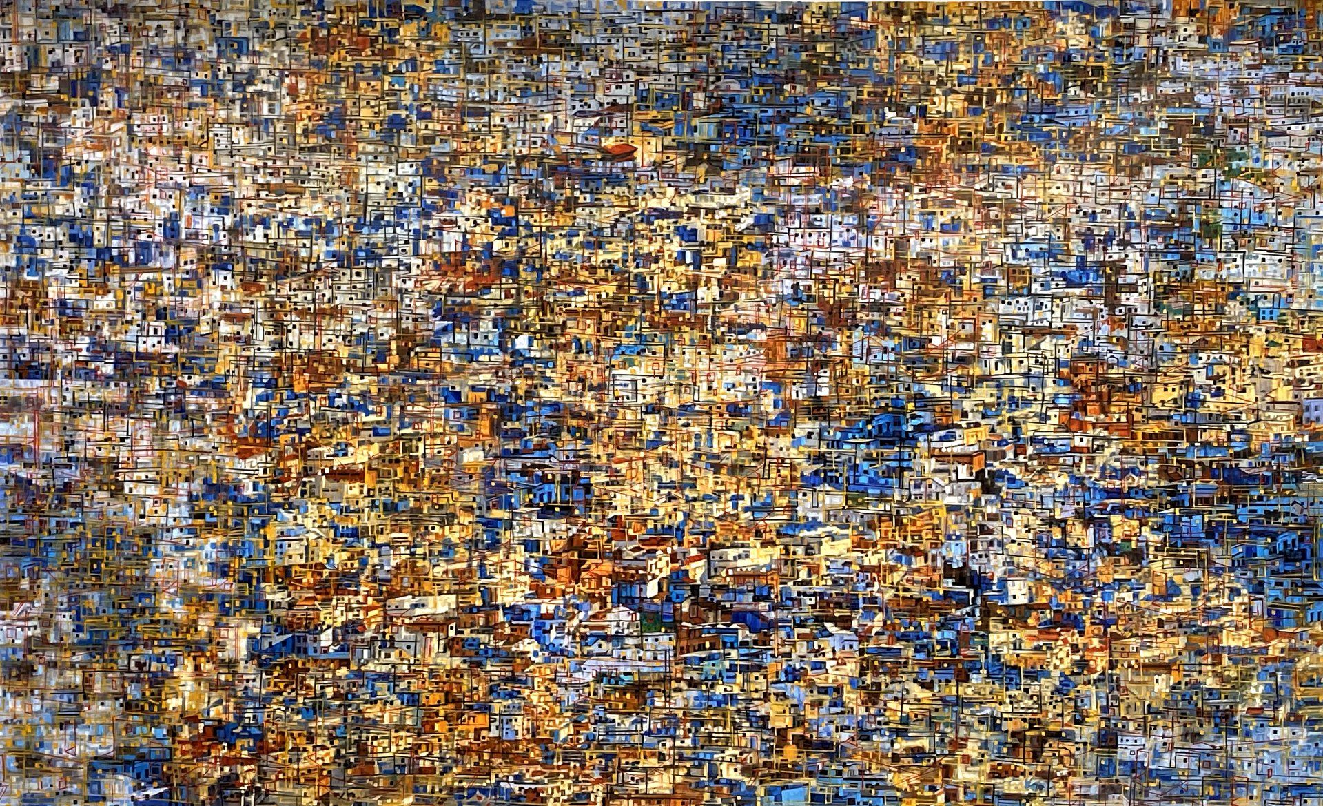 He has explored these themes across many mediums from video and sculptural installations to fine tapestries, but painting has always been the core practice in his work. Imagery generated from his monumental installations such as ‘Genie’ at The Imperial War Museum, ‘Enter Ghost, Exit Ghost’ at the Yang Gallery Beijing and ‘Giardino Occupato’ at the Venice Biennale, re-emerge and are reformulated in his paintings, mostly in his use of partly abstracted depictions of houses. These houses, presented in immersive installations or entirely covering the surface of paintings, have become a signature motif of his work, in which they are used to condense and intensify the relationships between abstraction, repetition and pattern, alongside ideas of the home and displacement.