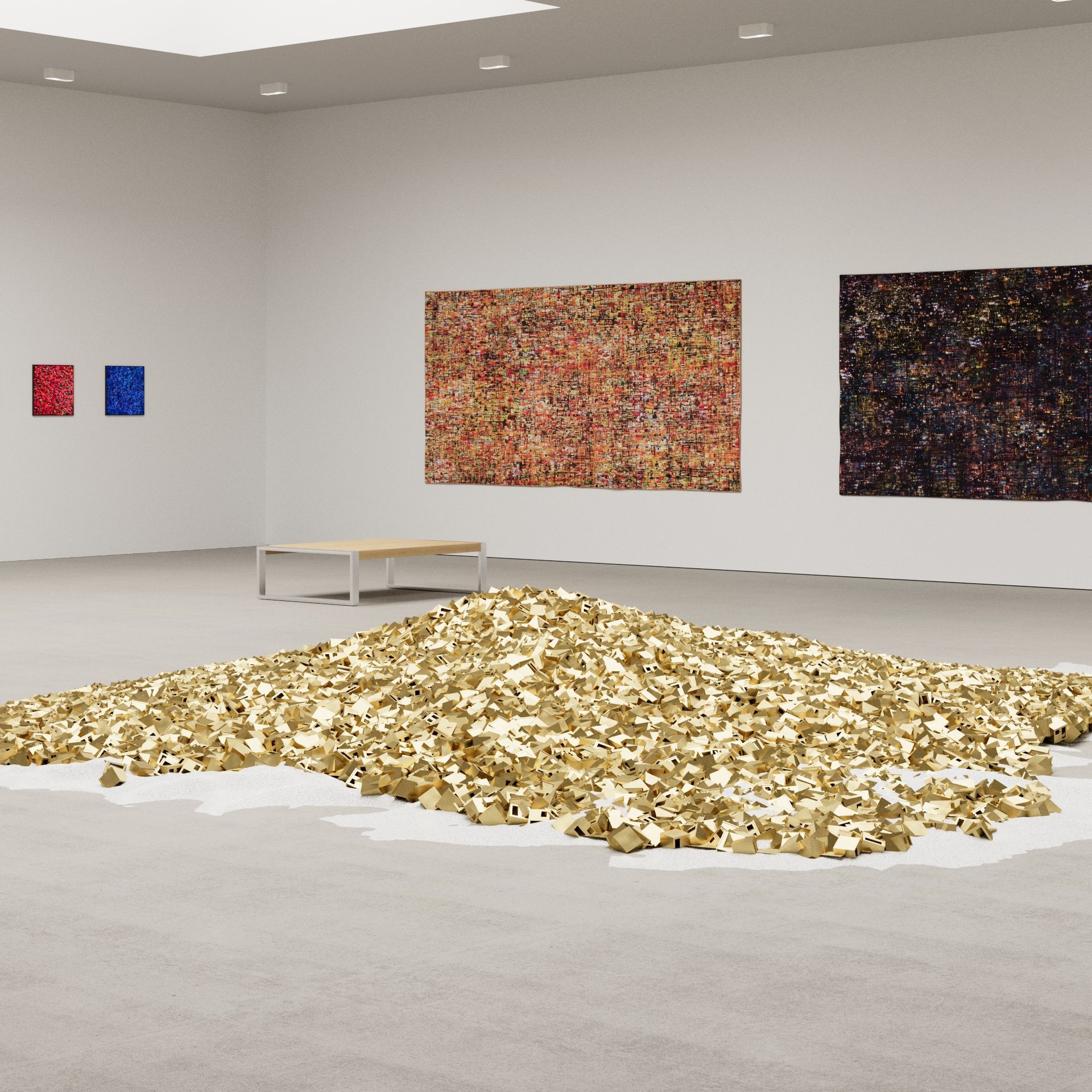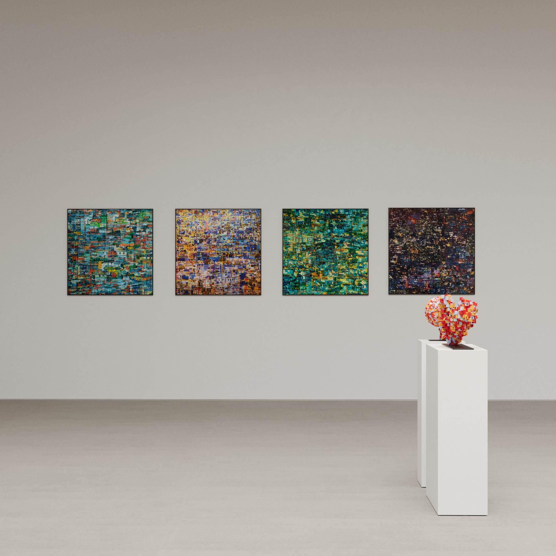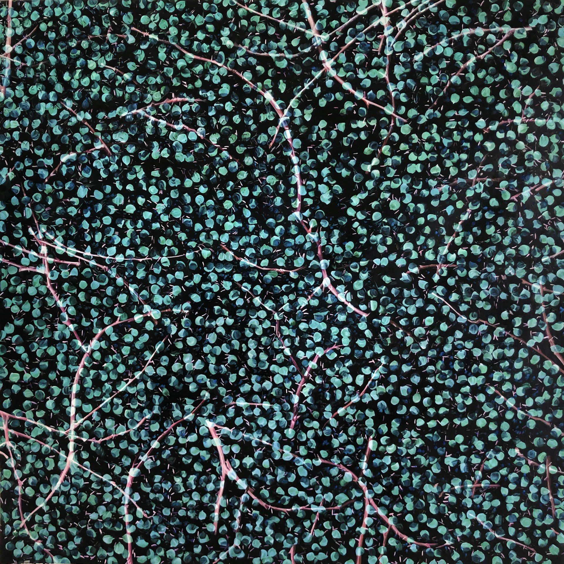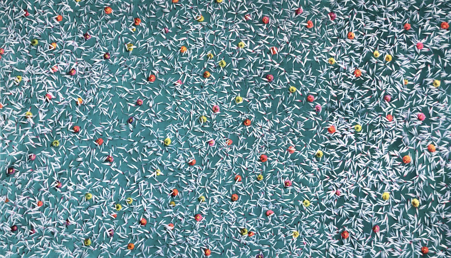 He has explored these themes across many mediums from video and sculptural installations to fine tapestries, but painting has always been the core practice in his work. Imagery generated from his monumental installations such as ‘Genie’ at The Imperial War Museum, ‘Enter Ghost, Exit Ghost’ at the Yang Gallery Beijing and ‘Giardino Occupato’ at the Venice Biennale, re-emerge and are reformulated in his paintings, mostly in his use of partly abstracted depictions of houses. These houses, presented in immersive installations or entirely covering the surface of paintings, have become a signature motif of his work, in which they are used to condense and intensify the relationships between abstraction, repetition and pattern, alongside ideas of the home and displacement.